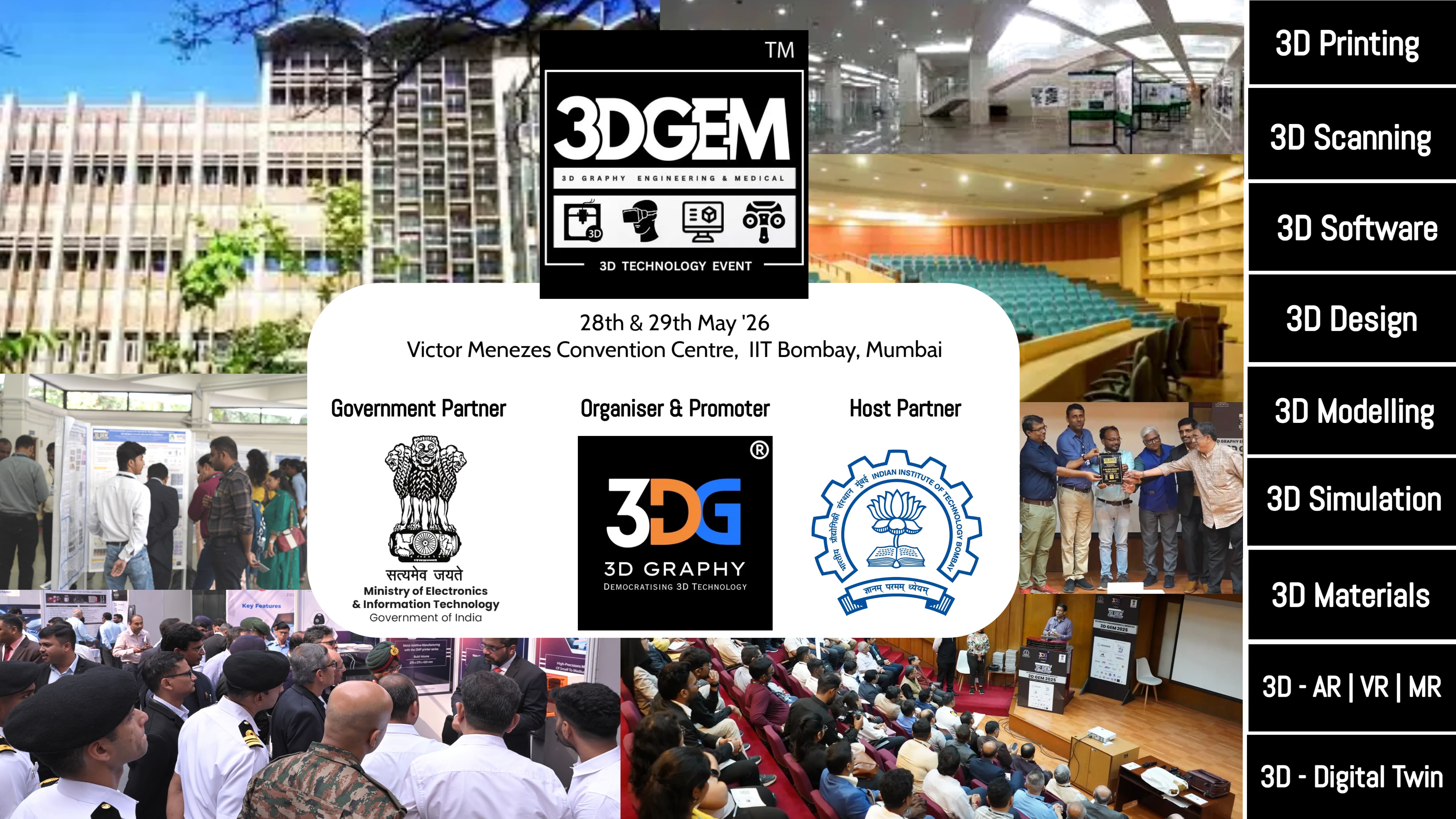 3D GRAPHY ENGINEERING & MEDICAL (3D GEM) - is an international flagship event promoting 3D Printing & 3D Visualisation in India. The 6th edition is held on 28th & 29th May 2026 at Victor Menezes Convention Centre, IIT Bombay. It is the only event conglomerate in India where all the End users are actively supporting event joining from different industries and specialisation to learn and explore the possibilities of 3D Technology.
