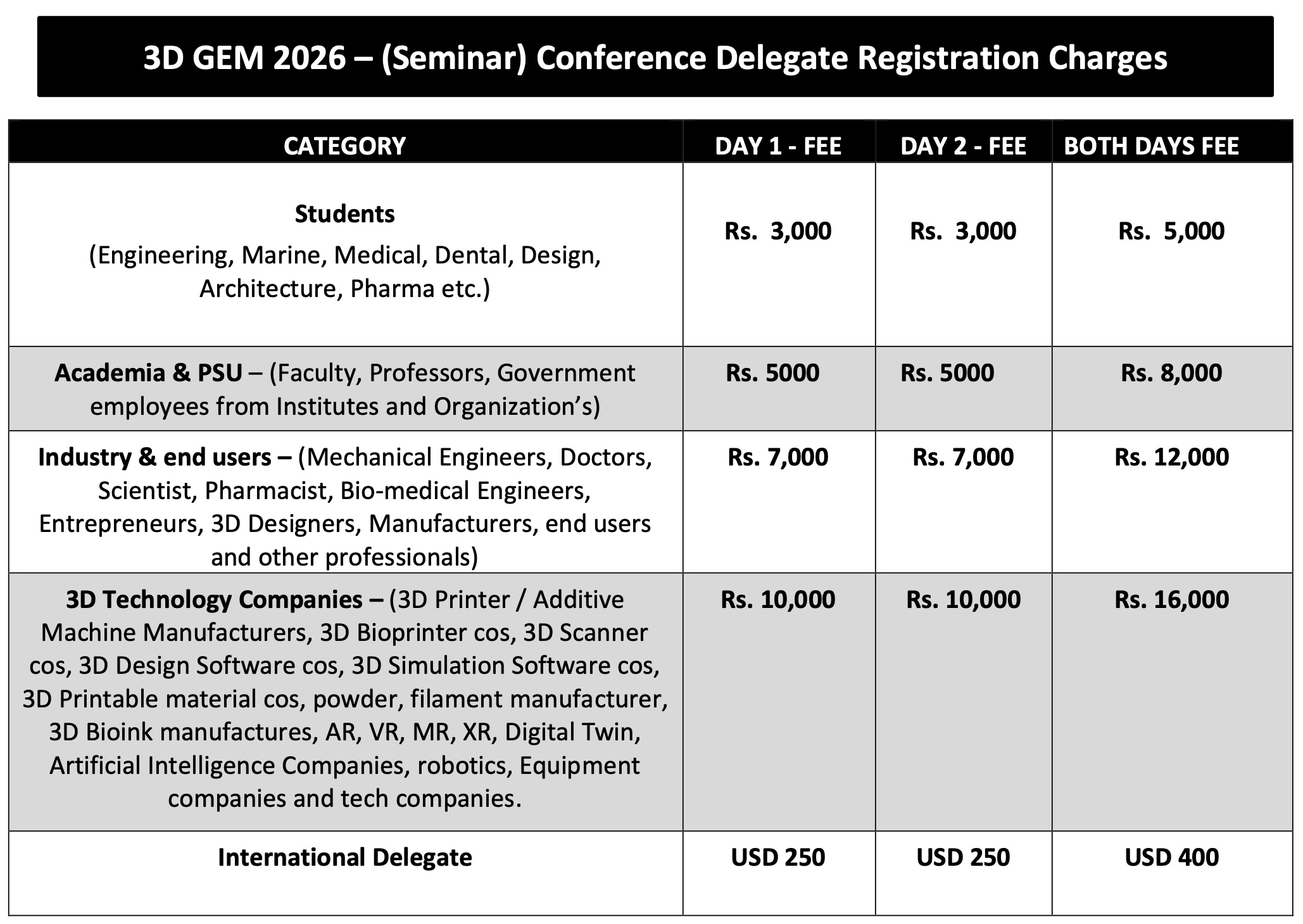 6. Delegate Fee – 3D Technology Cos – Participants registering as delegate must pay ₹ 16,000/- (inclusive of all taxes)for both days of the event.