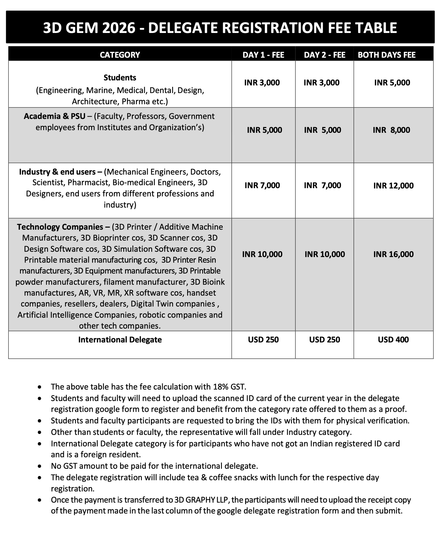 Category: Delegate registration (Students / Faculty / Industry/ 3D Technology Cos / International Delegate)
