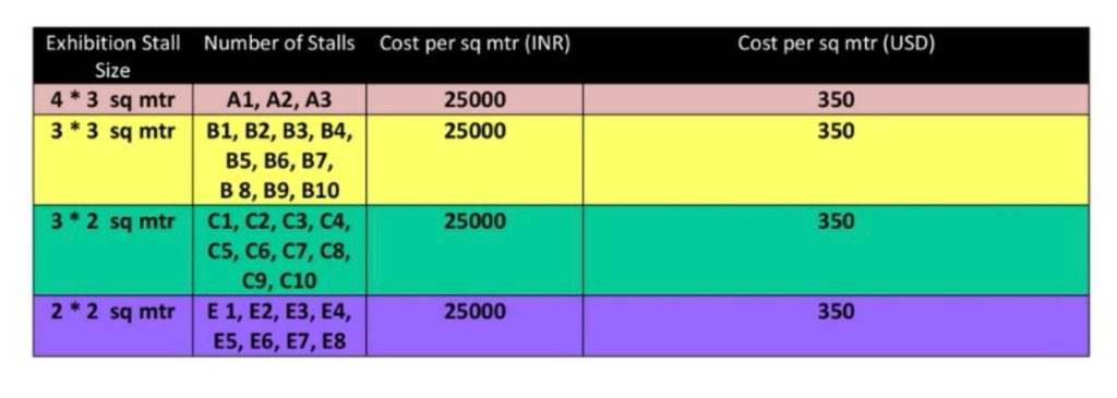 2. One delegate is complimentary with one standard stall of (2 * 2 Sq mtr), 2 delegates complimentary (3 * 2 Sq mtr)