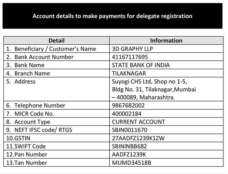 10. To register and confirm the booking of your stall, the payment will need to be made in favor of 3D Graphy LLP.