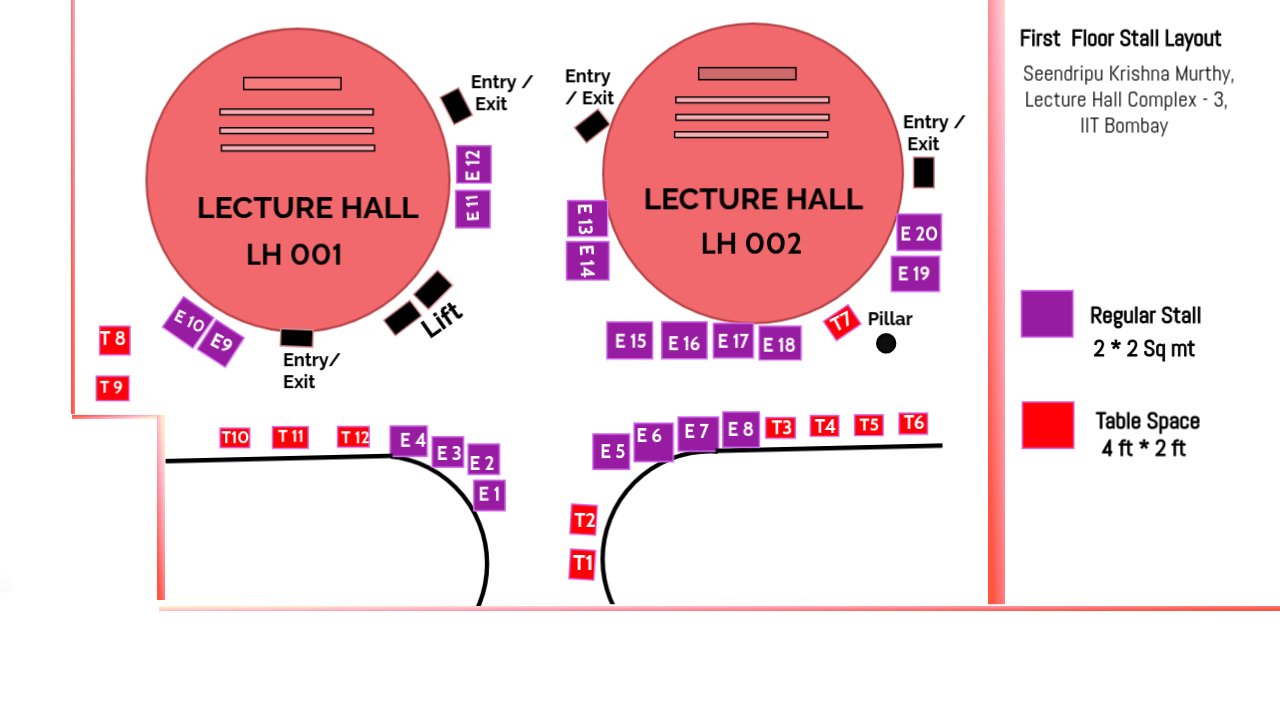 1. Company booking the Stall will get a Facia Name, 2 spotlights, 2 chairs, carpet, 1 table ( 3 * 2 ft) , 1 Plug point and 1 Dust bin.