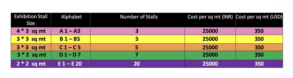 2. One delegate is complimentary with one standard stall of (2 * 2 Sq mt), 2 delegates complimentary (3 * 2 Sq mt)