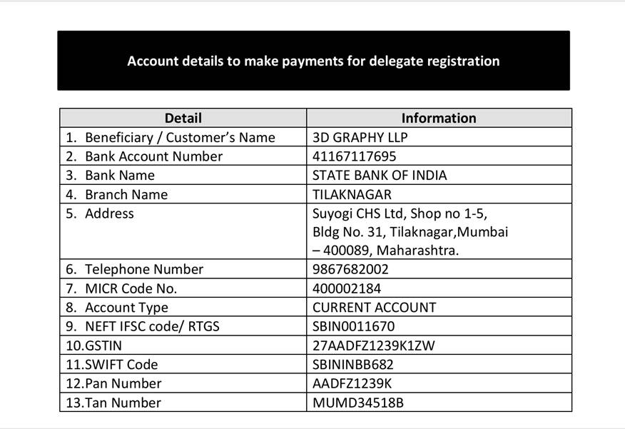 - Send a copy of the acknowledgement payment Slip to 3dgraphy email address for reference – tejal@3dgraphy.in or george@3dgraphy.in