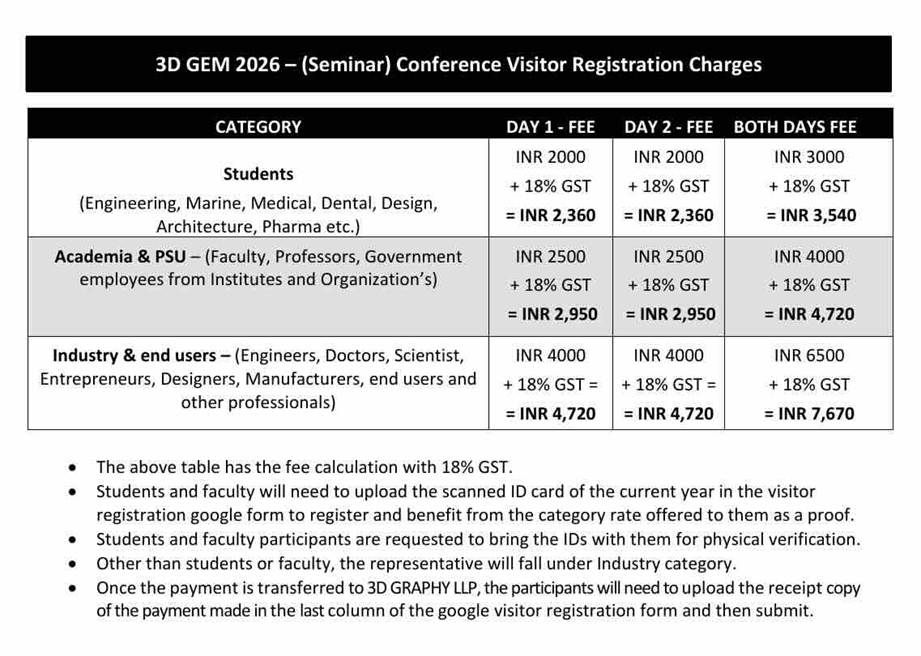 - Online Pre-events Free – You can also visit all the 11 Online Pre-events free as a delegate starting from 28th January to 24th April 2026. Total 33 hrs of lectures and sessions with 3D technology experts with 60 plus speakers sharing knowledge on different subjects and topics prepared in advance for the main physical event. Here are the details of the online event found in the link of this website https://3dgem.in/index.php/pre-events/